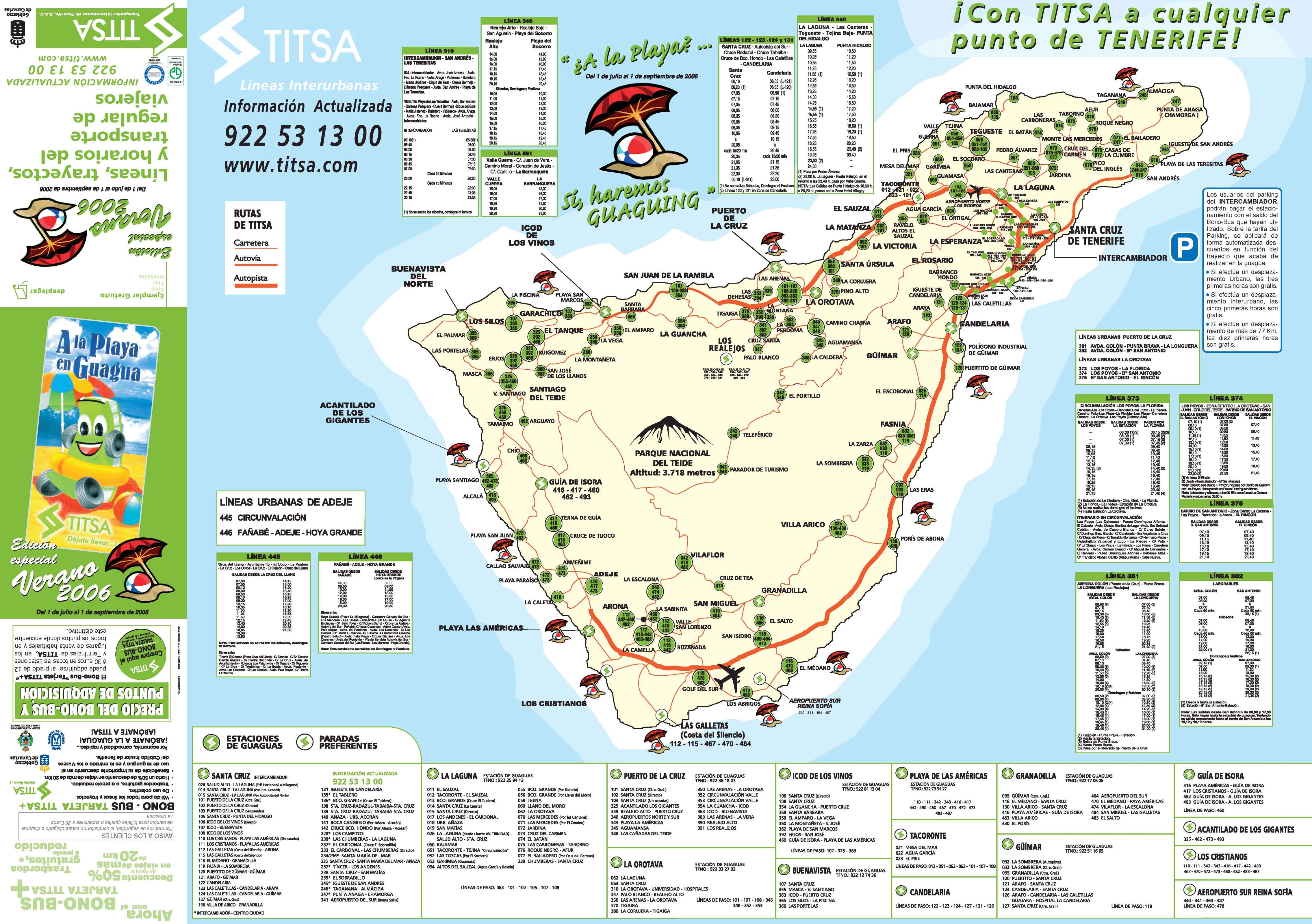 Icodból sok busz járat indul, az alábbi térképen áttekinthető, 354, 358, 359, 364. A 460-as busszal juthatunk le délre, Costa Adeje strandjai kiválóak, ott nagyon fejlődik a turizmus és a hozzá kapcsolódó szolgáltatások. Los Cristianos annyira tele van hotelekkel és emberekkel, hogy nyugodtan mondhatjuk, hogy túlzásba estek. A várost keresztezi a 363-as busz vonala, ami Buenavista és Puerto Cruz között közlekedik. Hétköznap a 107-es busz Buenavista és a főváros (Santa Cruz) között közlekedik, érintve az északi repülőteret (Tenerife North, TFN), így ez is nagyon fontos.